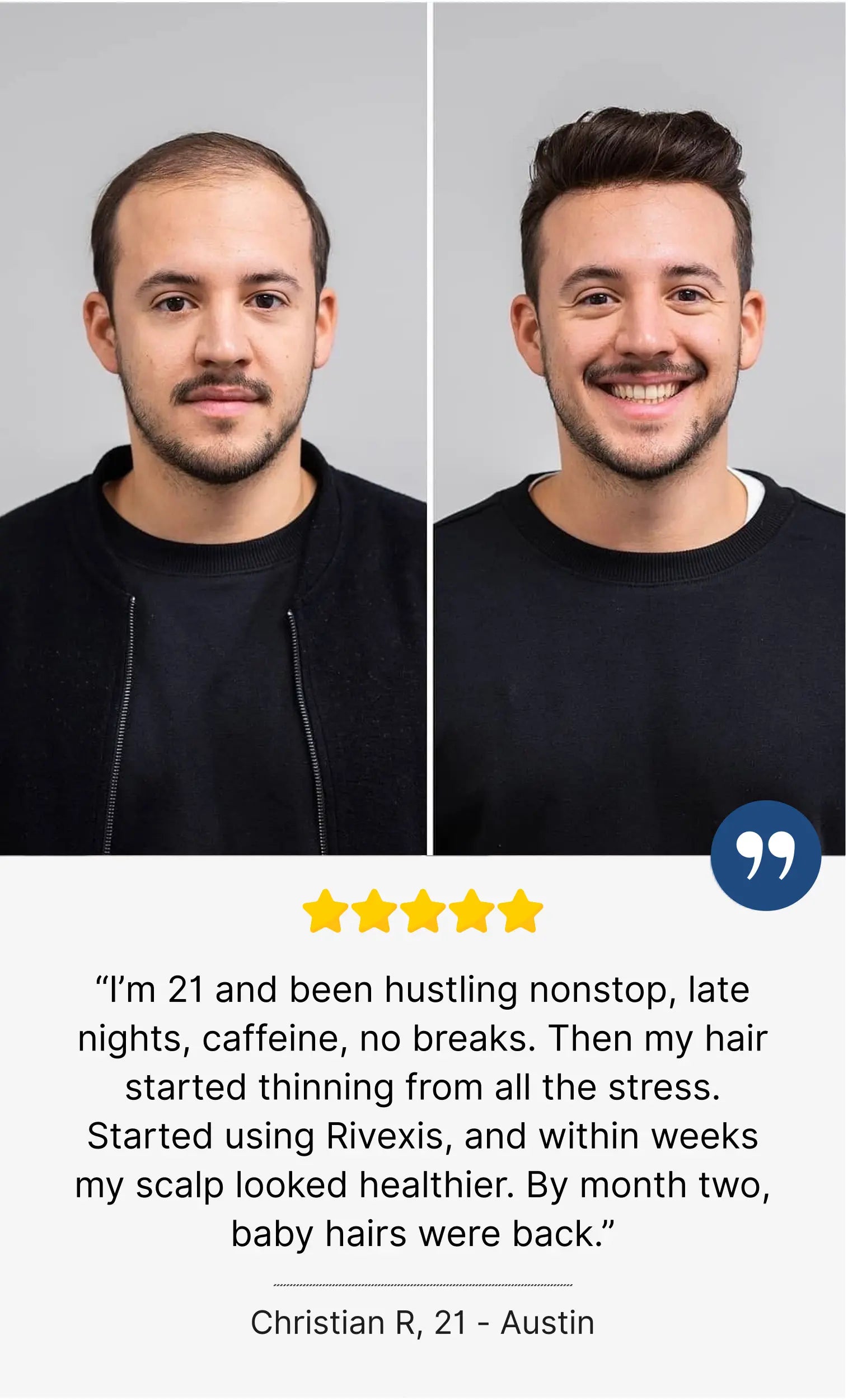 If you’re noticing early thinning — especially around your hairline or temples — Rivexis™ is built for you. Thousands of men have already regrown visible baby hairs using this exact formula. It’s not magic, it’s science-backed consistency.